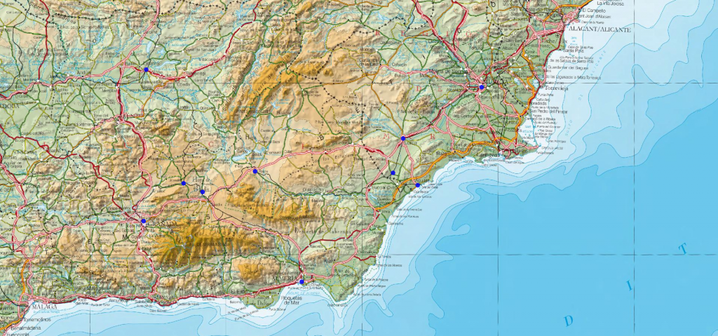 Mapas de conjunto del sureste de España con la provincia de Almería en el centro. Las líneas de ferrocarril en trazado negro continuo. Se han destacado en azul los principales orígenes y destinos y nudos de conexión de las diferentes líneas. Tramo Almendricos – Baza – Guadix clausurado y fuera de servicio desde enero de 1985. Instituto Geográfico Nacional, ambos obtenidos del original a escala 1/1.000.000.