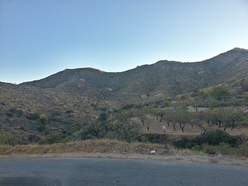 La primera zona que hemos visitado ha sido la menos interesante de todas. Hacia el centro de la sierra, y en la vertiente sur, existen una serie de labores a cielo abierto de pequeña magnitud. Se trata de los terrenos ocupados por la concesión Victoria. Llegamos desde la pedanía de El Pilar, por la estrecha carretera que va hasta el Chive. Apenas a un kilómetro desde el cruce, dejamos el coche, y remontamos un pequeño barranco que en su día estuvo poblado por chumberas, hasta la zona de las minas.