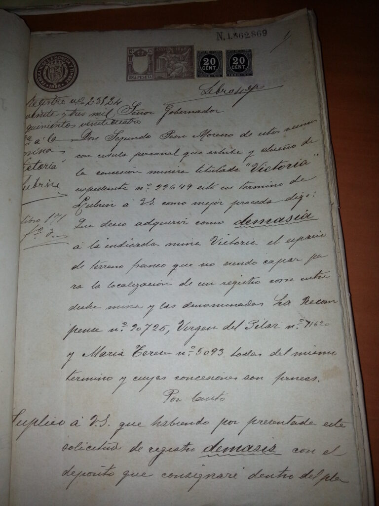 No obstante, es en 1900 cuando inicia una frenética actividad de adquisición de minas a lo largo de esta pequeña sierra (La Unión y mi Genoveva, La Recompensa, Las Rozas Bilbaínas, El Triunvirato, María Teresa, El León Bravo y Virgen del Pilar). Merece la pena detenerse en estas tres últimas, que a la postre, resultaron ser las más productivas. La forma de adquirirlas fue por partes. El 23/02/1900 compra a José García Sueca el 10% de ellas, y el 06/04/1900 hace lo propio con el 90% restante, del que eran titulares Clara Gorostegui Arrantia y los hermanos Agustín y Valentín Iza Rementería. Entendemos que esta última parte es la herencia que les correspondía del industrial vizcaíno Fernando Iza, del que consta la existencia de tratos mercantiles con Víctor Chávarri, uno de los mayores inversores foráneos en las minas de Bédar de la época.