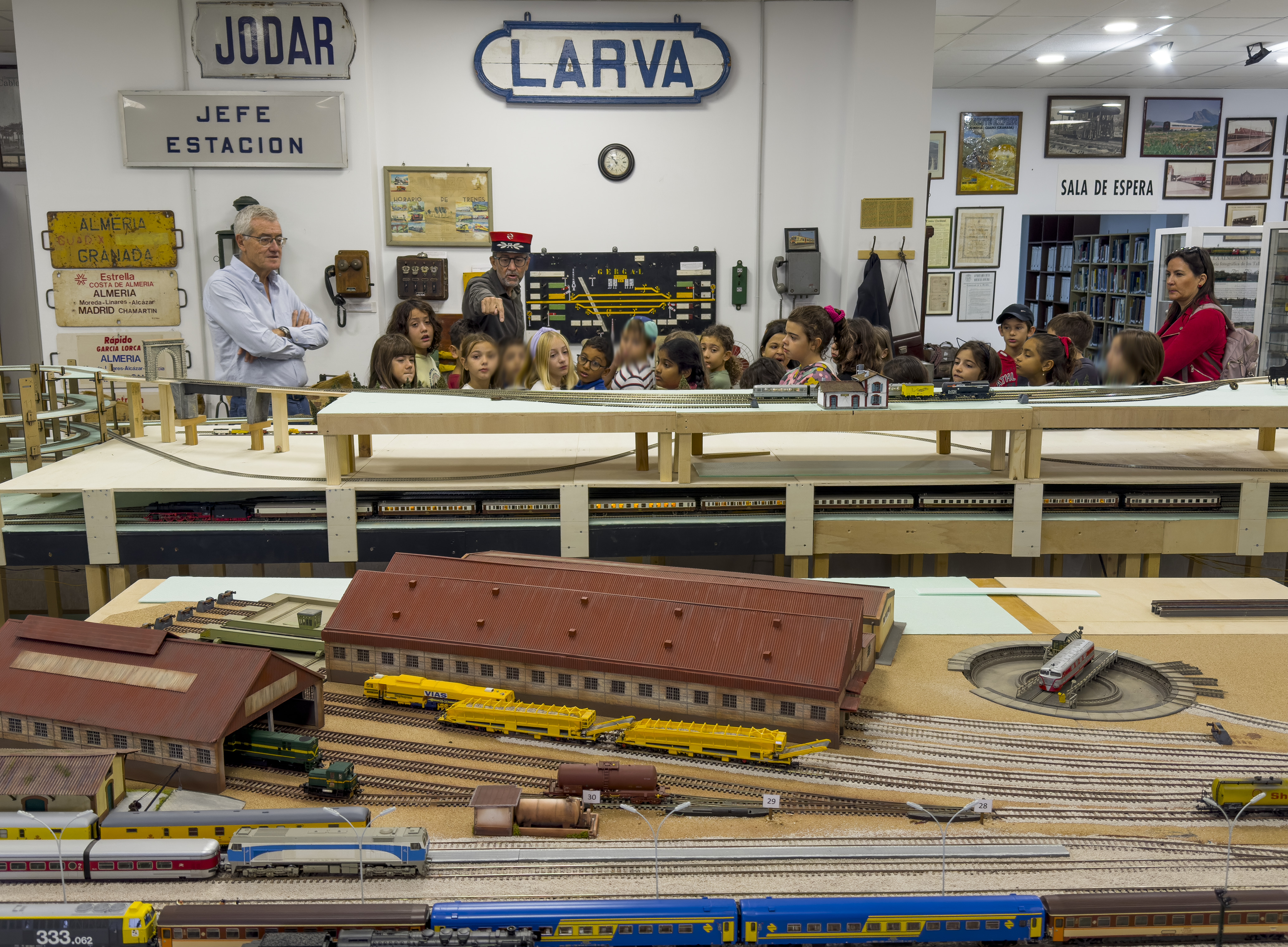 Con la gran maqueta en escala H0 como centro de atención, los escolares pudieron disfrutar de las circulaciones de diferentes trenes con sonido real y comprender cómo se organiza la explotación ferroviaria. Otro aspecto que despertó gran interés fue el de las piezas reales expuestas, como el teléfono de magneto, la báscula de pesaje de las mercancías o los faroles de mano.