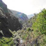 Atravesamos el río Genil, pletórico de agua por el deshielo del mes de mayo, y tomamos la vereda en unas empinadas rampas hasta una zona más liviana que va bordeando la montaña. Apenas tiene 1 metro de anchura y los barrancos son muy profundos, por lo que casi tenemos que ir en fila india y sin salirnos de la traza, a pesar de que la naturaleza que lo rodea te obligara a abrir los ojos para no perder detalle de todo su esplendor primaveral. No llegamos a imaginarnos cómo plantearon los ingenieros de la época penetrar en un terreno tan abrupto, si casi no hay espacio para construir una plataforma si no es a base de desmontes importantes.