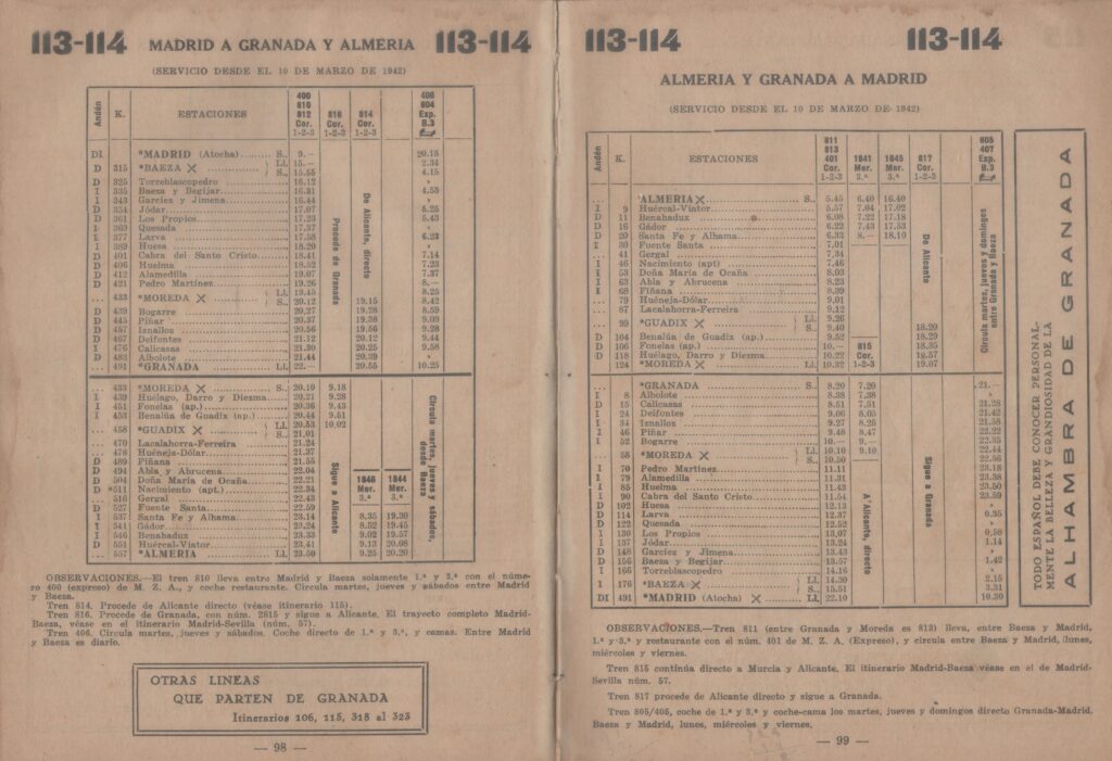 Los documentos que se reproducen están extraídos del Horario-guía de ferrocarriles – Servicio oficial, publicado el 1 de abril de 1942. Con un valor de 4 pesetas, era una publicación mensual con los horarios y tarifas de los ferrocarriles españoles que constaba de las siguientes secciones: