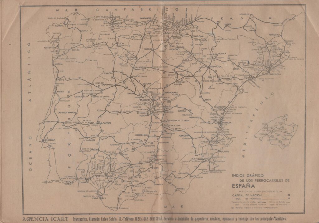 Esta valiosa guía es un compendio de toda la red de ferrocarriles existente en España en esa época, donde aún se dividen los itinerarios de ancho ibérico por el ámbito de las compañías privadas que habían sido nacionalizadas un año antes, en 1941. También se incluyen los ferrocarriles de vía estrecha agrupados geográficamente: centro de España; Levante, Aragón y Cataluña; sector Norte,; Extremadura y Sur; Baleares y Marruecos.