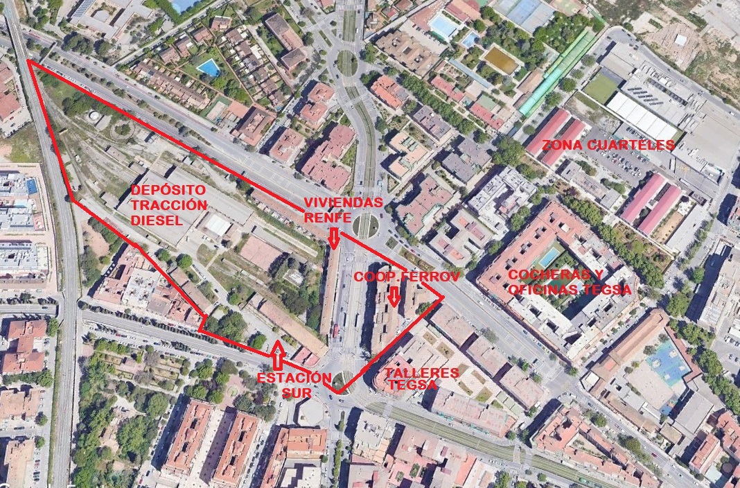 En 1956, Renfe presentó proyecto de construcción de 80 viviendas para ferroviarios en los terrenos de Sur. El grupo lo formaban dos grandes bloques unidos en escuadra proyectados por el arquitecto granadino Luis Álvarez de Cienfuegos, siendo entregadas en un acto con presencia de las máximas autoridades el 20 de junio de 1959 (Ideal, 21 de junio de 1959). La construcción del grupo de viviendas se realizó conforme a las alineaciones establecidas en el proyecto de prolongación del Camino de Ronda aprobado por los ministerios de Obras Públicas y Gobernación el 30 de enero de 1958. Esta ampliación afectaba a una parte de la zona final de las vías y los antiguos muelles de mercancías, dejando al otro lado de la prolongación de la avenida, una parcela de 2524 m2 desconectada de la antigua estación. En dicha parcela se realizaría solicitud por parte de la Cooperativa Ferroviaria de viviendas San Juan de Dios a finales de 1965 para construir una promoción de 98 viviendas para trabajadores ferroviarios, que se unía a la otra promoción realizada por esta misma cooperativa en la zona del Estadio de la Juventud, junto a las vías de entrada de la línea de Bobadilla, conocida como grupo Santamaría de 116 viviendas. Las obras no dieron comienzo hasta el año 1968.