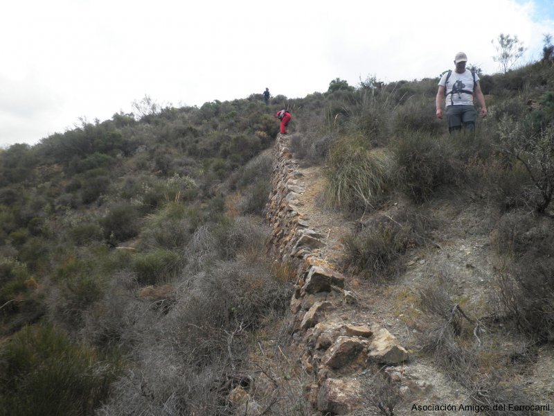 Solamente con la intuición y las referencias de Google Earth, la expedición partió desde el castillete del gran plano inclinado (más de 1 km. de longitud) bajando por su traza desde los 1.260 m. hasta la cota 960 m. Aparecieron varios tipos de escarpias, prueba evidente del lugar transitado, así como restos de traviesas que se desmenuzaron al tocarlas. La maleza se había hecho dueña y señora de lo que el hombre construyó y la bajada fue complicada, pero mereció la pena comprobar que el ingenio humano no tiene límites. En la base del plano se pusieron de manifiesto las dudas entre los participantes en esta ruta sobre cómo se salvaba un barranco hasta alcanzar la mina “Por si acaso” y, también, comprobar la existencia de la base de un pequeño puente por el que transcurriría la vía minera que llegaba a la boca de esta mina. Aquí, el polvo del mineral de hierro teñía de rojo toda la zona y ofrecía una cantidad de rocas que hizo las delicias de los más aficionados a la mineralogía.