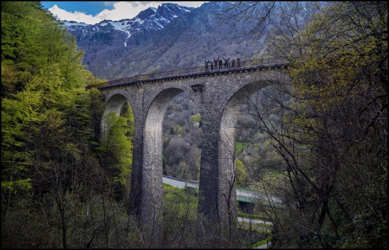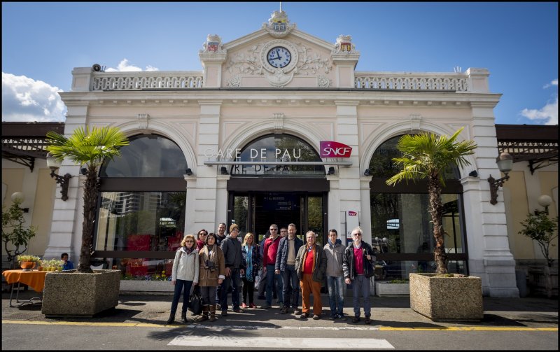 Una vez llegados a la estación de Paul en coche y con la decepción de no haber podido subir a la ciudad en el esplendoroso funicular (estaba fuera de servicio), dimos un paseo hasta el centro histórico donde los manifestantes del  primero de mayo recogían sus bártulos y nos sirvieron de guías. Comimos en la zona centro y regresamos a la estación para, esta vez sí, volver en tren y sin contratiempos que reseñar. Una vez reagrupados en Oloron y ya solo a bordo de los dos coches, iniciamos el regreso haciendo paradas continuas para examinar diversos puntos de interés de la línea que Alejandro había señalado, con atención especial al tramo entre Oloron y Bedous, totalmente renovado para su reapertura el 26 de junio de este año.  Pudimos comprobar con alegría que sí es posible que en un futuro no muy lejano se vuelva a poder viajar en tren entre España y Francia por Canfranc.