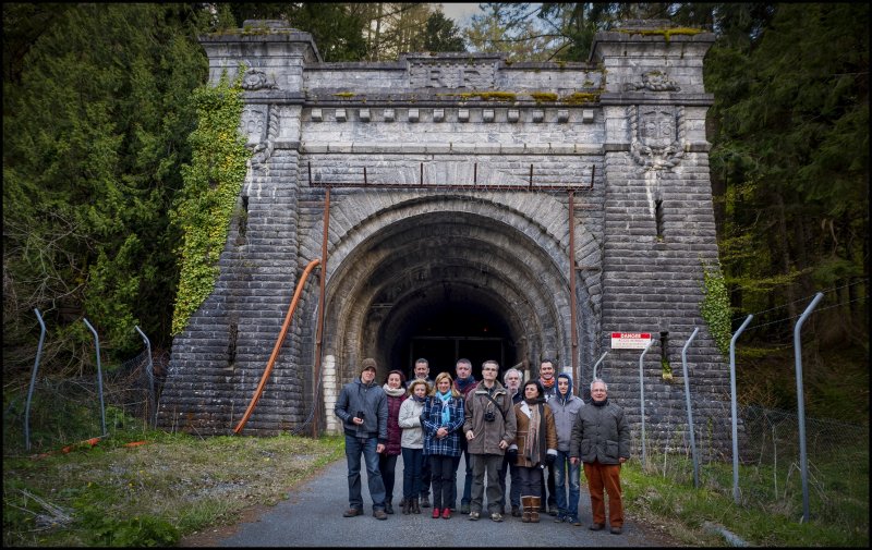 Continuamos paseando un  rato más pese al frío y el aguacero que empezaba a hacer acto de presencia. Las cumbres cercanas  aparecían nevadas y la ventisca arrojaba nieve granulada sobre nuestras cabezas. Bunkers, gigantescos hangares, vagones, coches, grúas y una enorme placa giratoria eran los vestigios más llamativos. Todo se construyó de acuerdo al mastodóntico tamaño del edificio y se preparó para ofrecer una gran cantidad de servicios de todo tipo. Hoy día, impone el silencio reinante en todo el recinto junto con su aire de decaimiento y abandono.  La comida tuvo lugar en el restaurante del antiguo hotel Ara, donde se alojaban los camioneros suizos que transportaban el famoso oro por carretera. Después de comer asistimos a una visita guiada a las instalaciones partiendo del vestíbulo principal del edificio. Conocimos un poco mejor la historia a través de la guía local y de los videos donde supervivientes explicaban sus experiencias. Finalizada la visita, realizamos un pequeño recorrido en el “canfranero” de la tarde para llegar hasta Jaca para conocer la estación y, sin apenas tiempo, volvimos a subir al tren que nos devolvería a Canfranc. Finalmente, visitamos también la boca “española” del túnel de Somport cuyo acceso está prohibido ya que, actualmente, es la sede de un renombrado laboratorio científico.